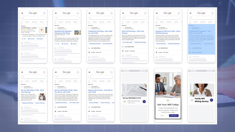 Our Google Ads campaign featured strong keyword targeting (e.g., Affordable Will Preparation, Trust Wills £19.99) and emotion-driven copy that boosted ad strength and CTR.